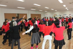 多数のダンサーの参加で二重、三重の輪をつくり、和気藹々(わきあいあい)。 各パートの曲数もゆったりとして、楽しく踊ることが出来ました。最後は会場一杯に広がり、ローズ・オブ・マイ・ハートでしめくくり、皆さんの笑顔が最高でした。 |