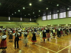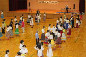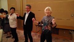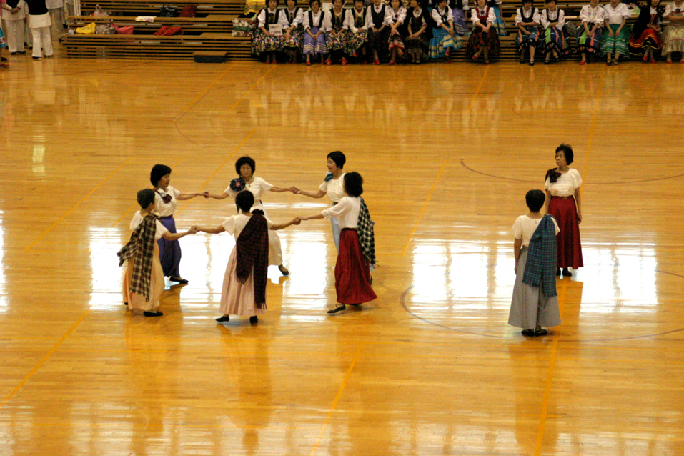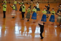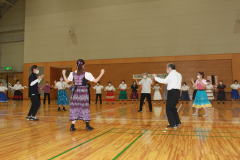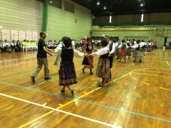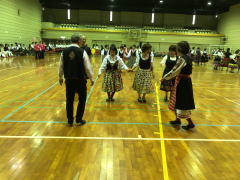 多数のダンサーの参加で二重、三重の輪をつくり、和気藹々(わきあいあい)。 各パートの曲数もゆったりとして、楽しく踊ることが出来ました。最後は会場一杯に広がり、ローズ・オブ・マイ・ハートでしめくくり、皆さんの笑顔が最高でした。 |