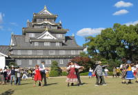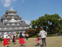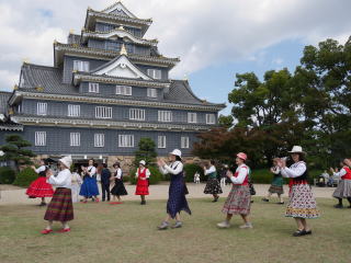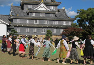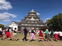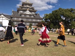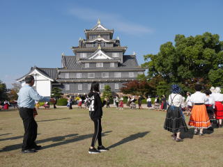 | 快晴のもと「岡山城で踊ろう楽しいフォークダンス」が開催されました。今年は、例年より観光客も多く、なんと!!ノルウェーからの留学生2名(男女、しかも若い!!)が一緒に踊ってくれました。1時間近く一緒にフォークダンス、民踊、レクリエーションダンスを楽しみました。また、炭坑節を踊っているときには、熊本からいらした方も踊ってくださいました。参加者元気いっぱいに踊った楽しい時間でした(#^.^#) | |